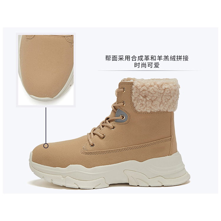 Ladies' stitching cute mid-cut boots and velvet warm and comfortable sneakers in autumn and winter.JIAN ER Shoes Company's new winter product recommendation will bring you different warmth in the cold winter.The upper is made of synthetic leather and lamb wool stitching, Smooth hand feeling, not easy to deform, outdoor travel is not afraid of the cold,which is fashionable and cute.The ankle support is high-top, the gentle ankle support is anti-crimping, and the cold wind is poured in, and the eversion fluff is more fashionable. Add velvet inside to improve warmth retention,Thick design, deep heat gathering. The plush lining softly wraps your feet for comfort and warmth against the severe cold in winter. The rubber outsole has a non-slip effect. Compared with ordinary short boots, sports shoes are lighter and more comfortable to wear. Increase the height within 4 cm, optimize the proportion of the body.The outsole is shock-absorbing and resilient, anti-skid and wear-resistant, with three-dimensional anti-skid patterns to walk every step steadily, making travel more secure.The stiff and stylish shoe design makes your outfit attractive, and calmly cope with every occasion, with excellent texture and soft fit.A pair of comfortable and versatile shoes will increase work efficiency.